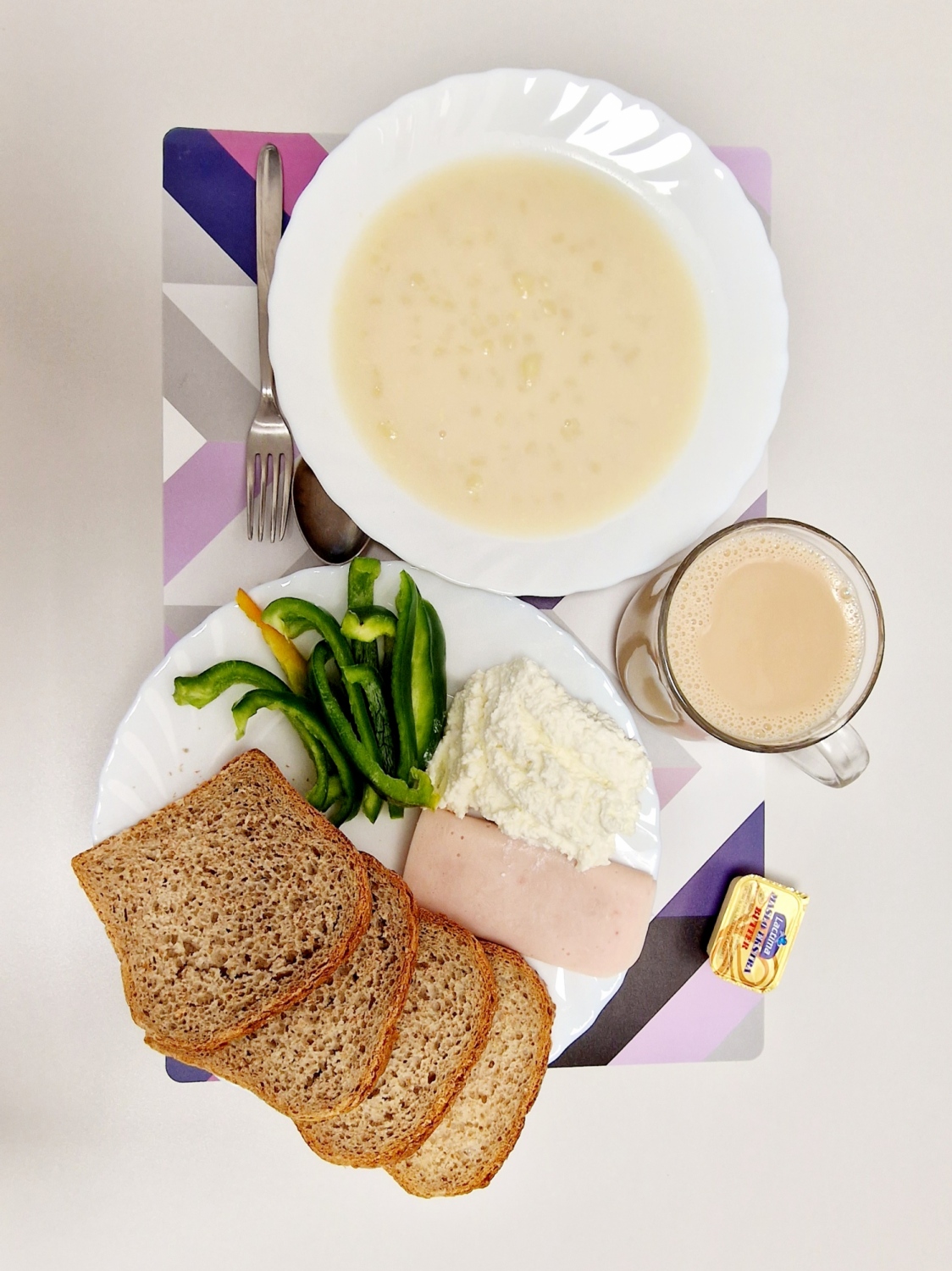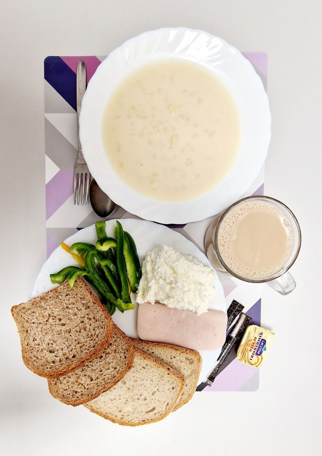 *Śniadanie* Makaron na mleku *300 ml* Chleb graham *100g* Masło 82% *15g* Polędwica delikatna *50g * Twarożek *60g* Papryka *100g* Kawa zbożowa na mleku *250ml* Herbata czarna *250ml*