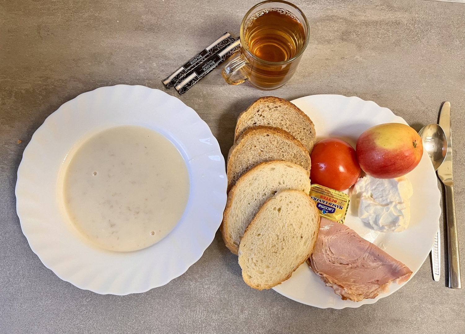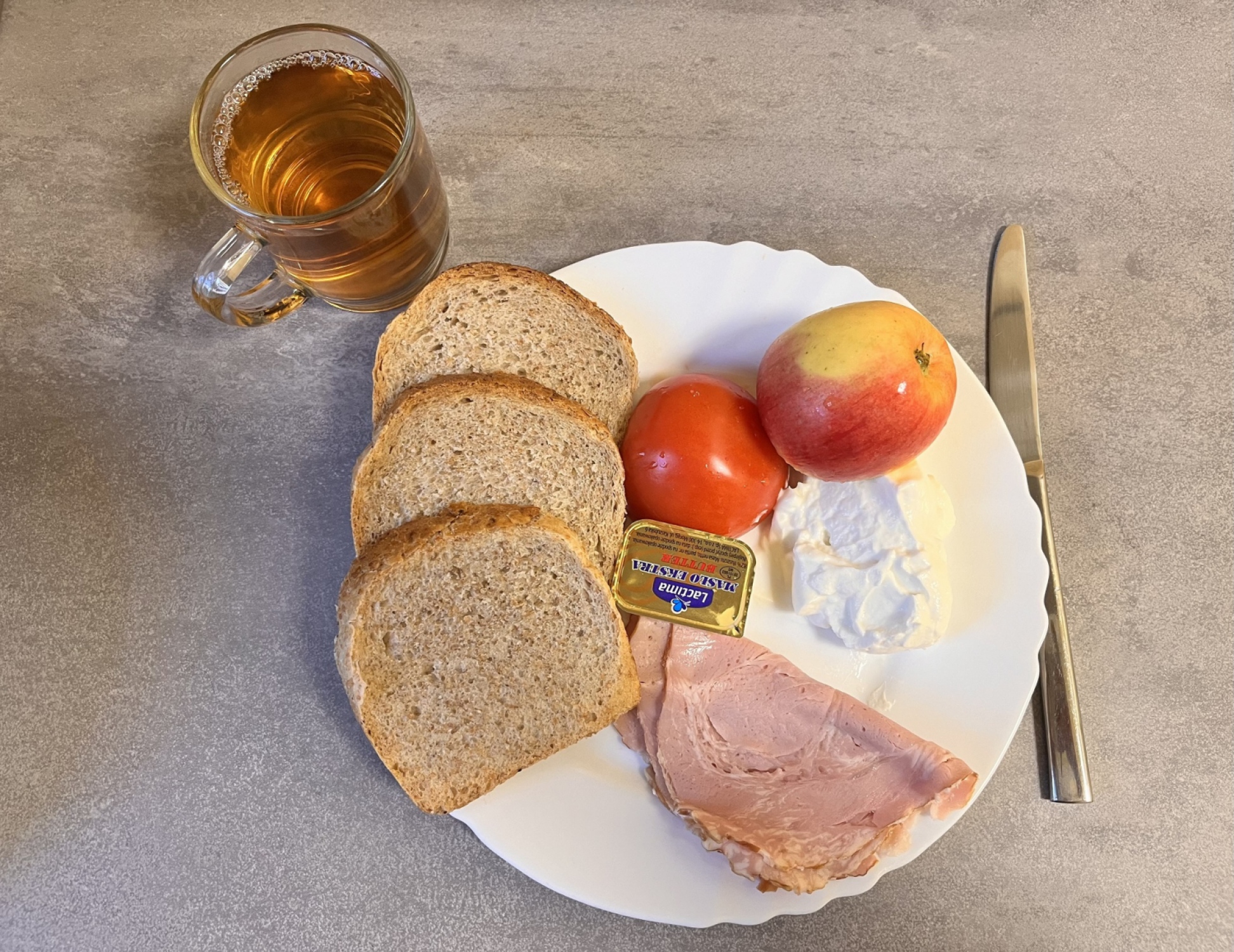 Śniadanie Chleb graham 100g Masło 82% 15g Serek homo naturalny 60g Szynka ze straganu 50g Pomidor 100g Jabłko 1 szt Herbata czarna 250 m