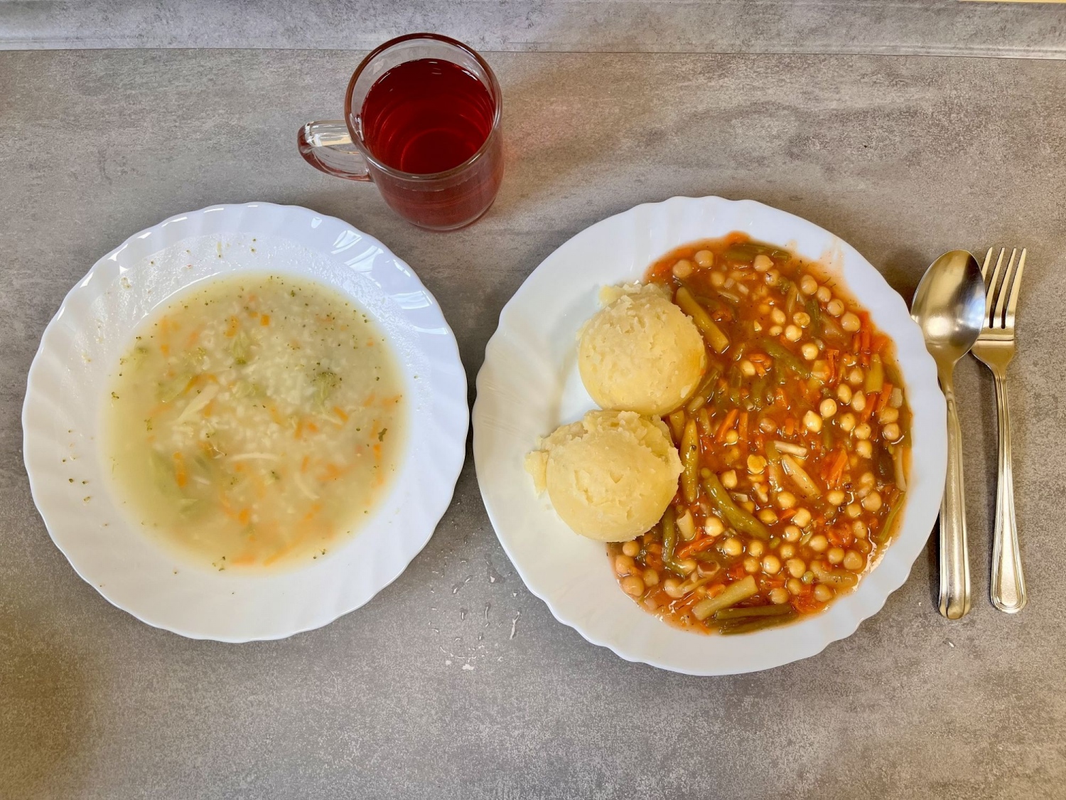 Obiad Brokułowa z ryżem 350 ml Gulasz warzywny z ciecierzycą 300g Ziemniaki 200g Kompot owocowy 250 ml