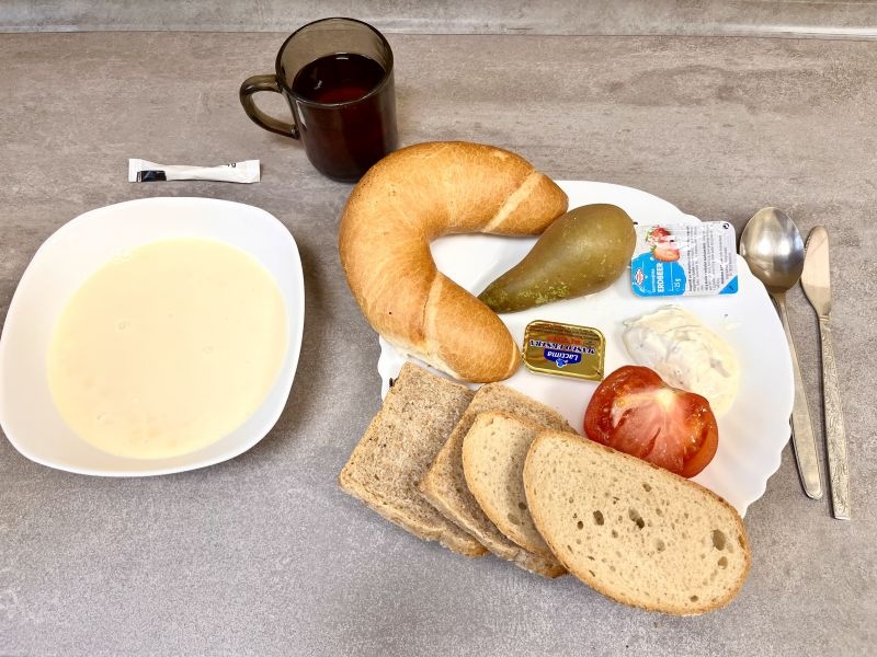 Śniadanie Zacierka na mleku 300 ml Chleb pszenno-żytni 50g Chleb graham 50g Masło 82% 15g Dżem 25g 1 szt Serek homo z natka pietruszki 60g Pomidor 100g Gruszka 1 szt Herbata czarna 250 ml Cukier 5g