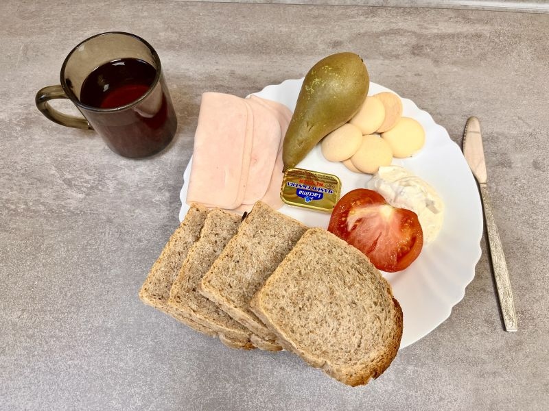 Śniadanie Chleb graham 100g Masło 82% 15g Polędwica delikatna 50g Serek homo z natka pietruszki 60g Pomidor 100g Gruszka 1 szt Herbata czarna 250 ml