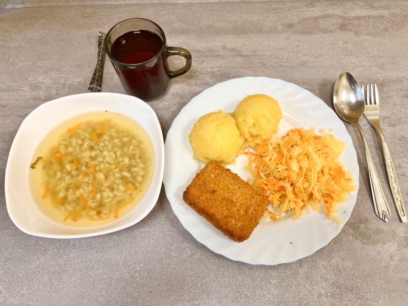 Obiad Krupnik jęczmienny 350 ml Mintaj panierowany kostka 120g Ziemniaki 200g Surówka z kapusty kiszonej z olejem 200g Kompot owocowy 250 ml Cukier 5g