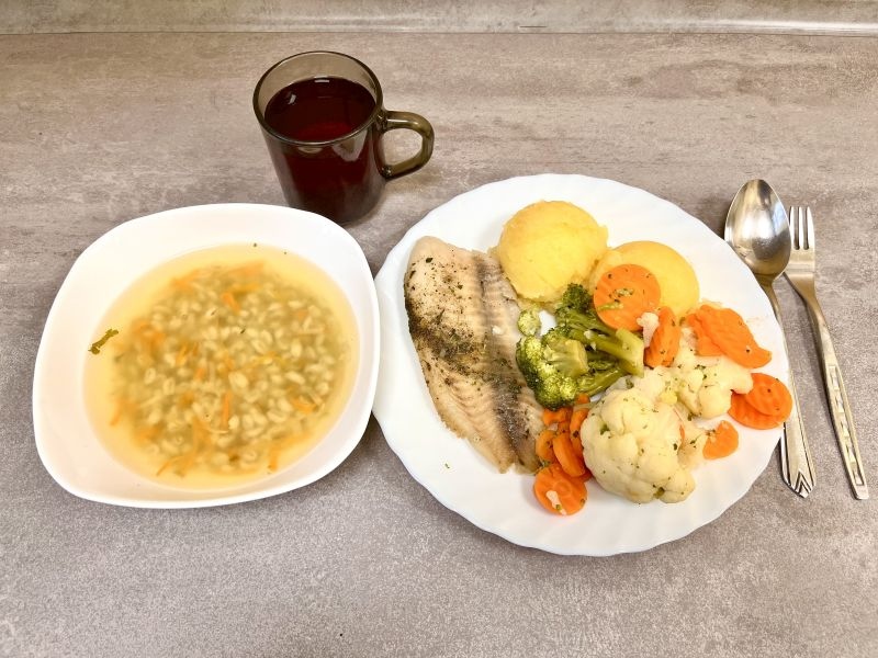 Obiad Krupnik jęczmienny 350 ml Ryba pieczona 120g Ziemniaki 200g Bukiet warzyw gotowanych królewski 200g Kompot owocowy 250 ml