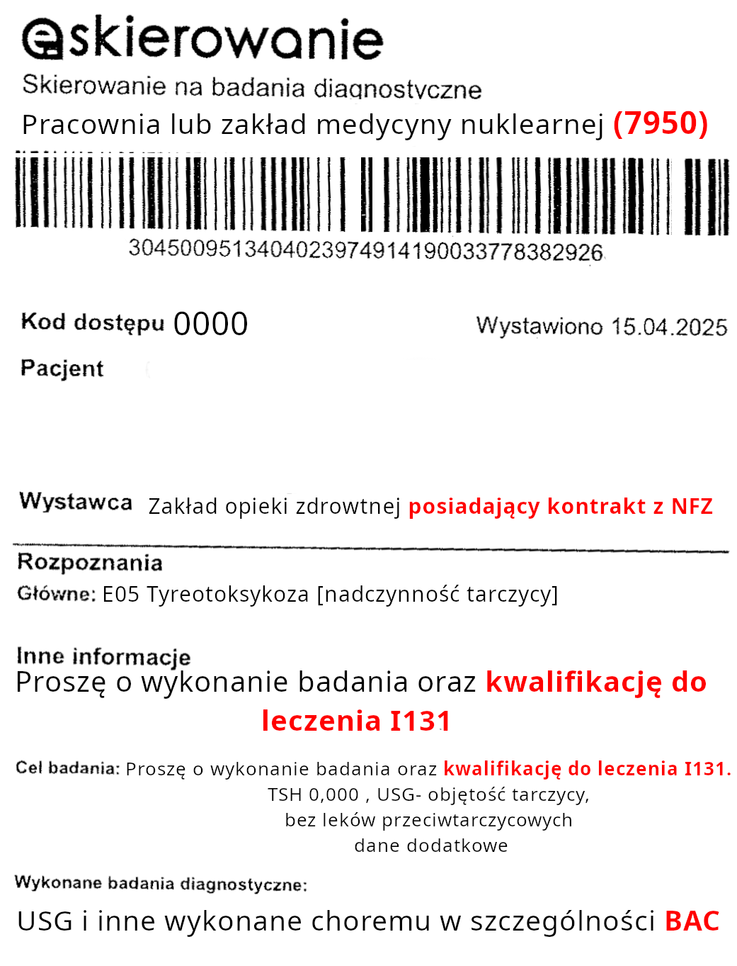W celu wykonania badania należy posiadać skierowania wystawione przez lekarza w ramach kontraktu z NFZ wzór wymaganego skierowania przedstawiony powyżej. Elementy zaznaczone kolorem czerwonym są bezwzględnie wymagane !
