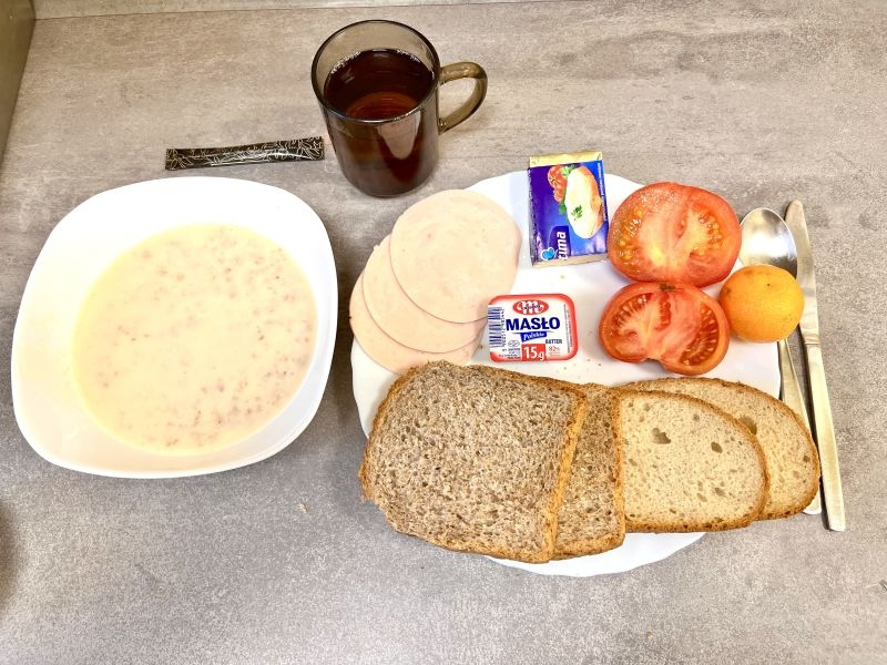 Śniadanie Płatki owsiane na mleku 300 ml Chleb pszenno-żytni 50g Chleb graham 50g Masło 82% 15g Ser topiony 50g Polędwica delikatna 50g Pomidor 100g Mandarynka 1 szt Herbata czarna 250 ml Cukier 5g