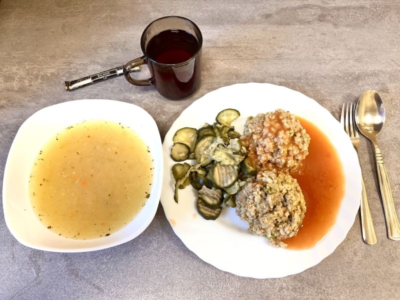 Obiad Ziemniaczana 350 ml Kaszotto z mięsem wieprzowym i warzywami 300g Sos pomidorowy 100 ml Surówka z kapusty białej z olejem 200g Kompot owocowy 250 ml